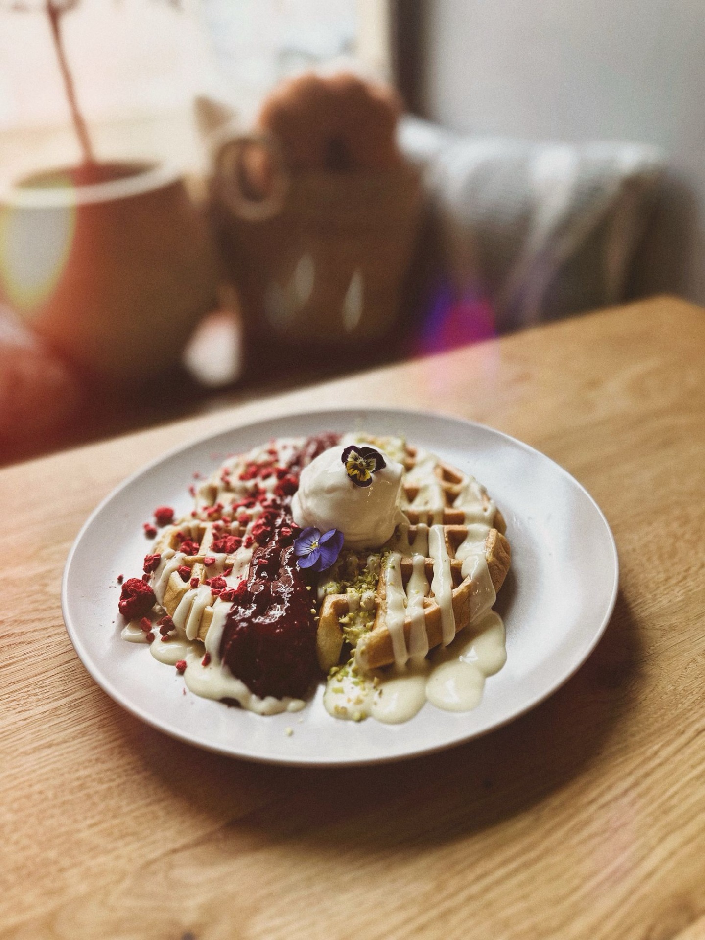 Nadýchané vafle s malinami, bílou čokoládou, vanilkovou zmrzlinou s fialkami.