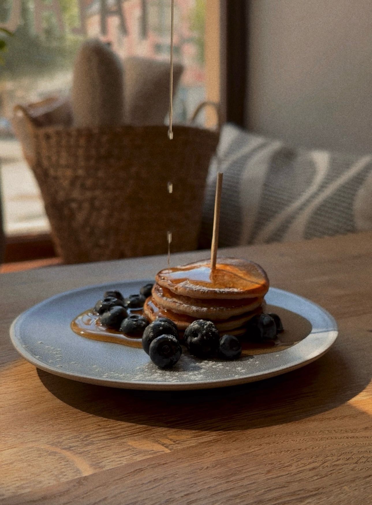 Nadýchané skořicové lívance s borůvkami a javorovým sirupem.