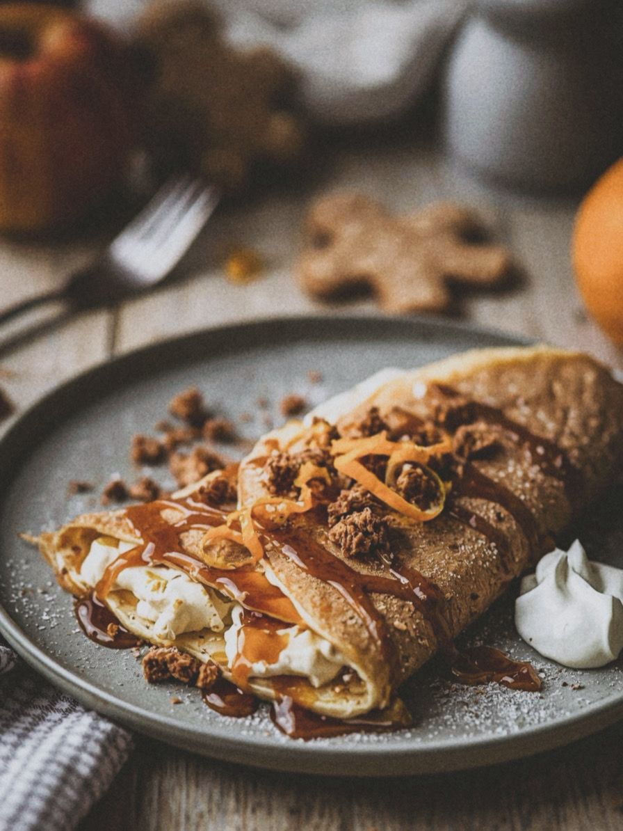 Perníčková palačinka s cream cheese, medem, jablkem, karamelovým krémem a pomerančovou kůrou.