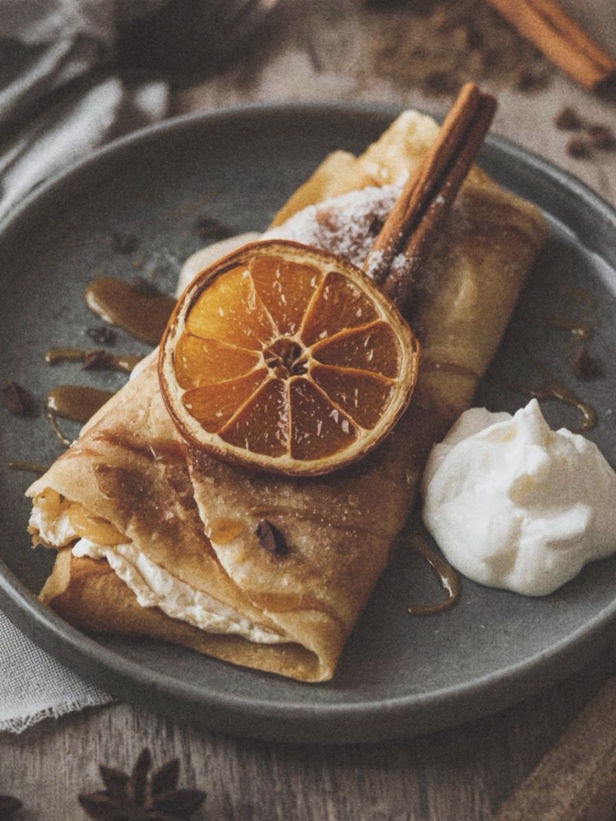 Vanilla Chai Latte palačinka - vanilkový crème pâtissière s chai latte kořením, karamelem a plátkem sušeného pomeranče
